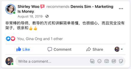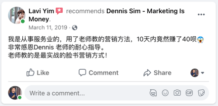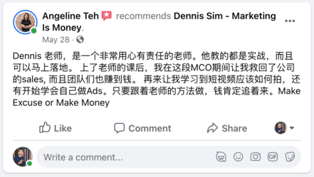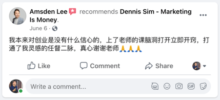 Dennis Sim 是一位企业家、网络营销战略师、国际演讲家和多家企业投资者。Dennis 有着西方的营销思维东方的营销作风把它们结合起来变成了自己的一套「赢销兵法」。他也通过这个兵法帮助了他的客户和学生们在短短的3年内通过线上和线下实现了8位数的爆炸性销售额!